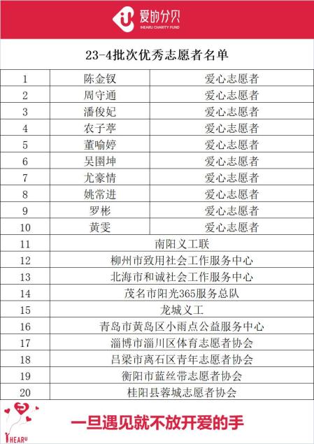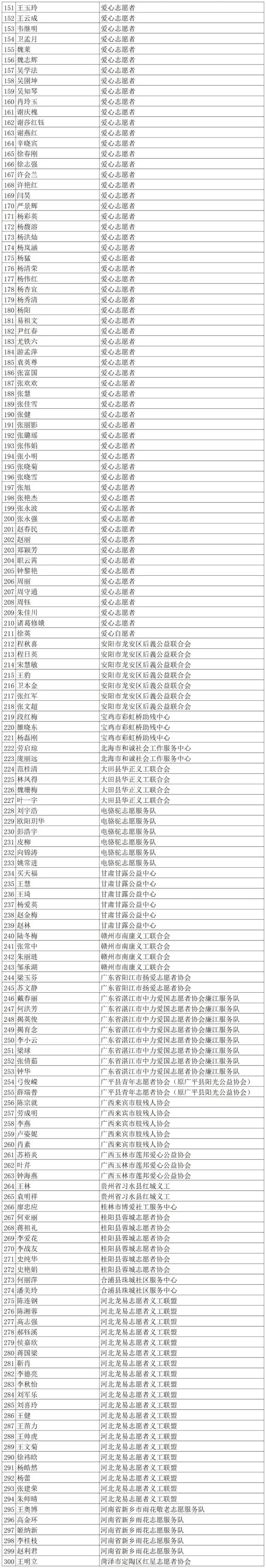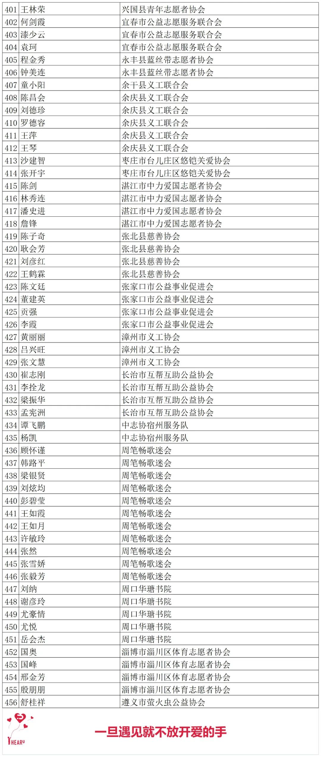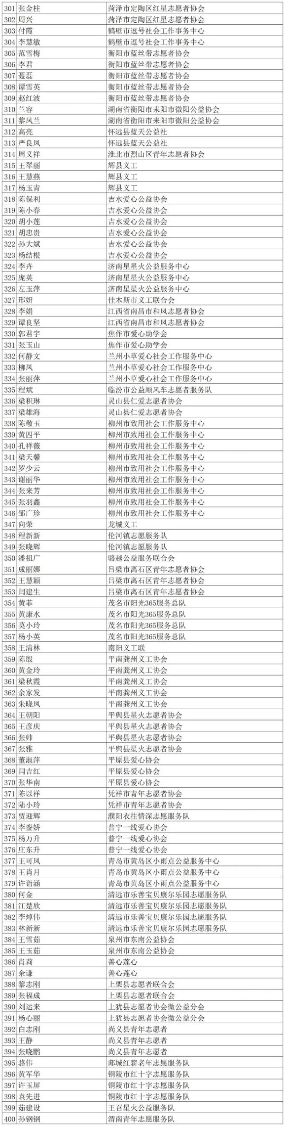 其中有10位个人志愿者和10个志愿者团体被评为“优秀志愿者”,他们是: