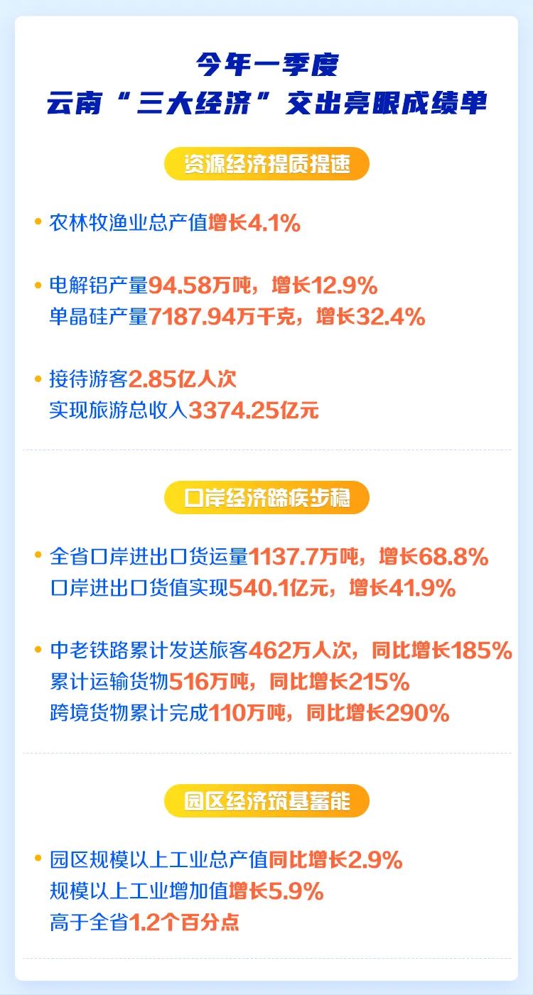 今年以来,全省上下鼓足干劲,全力以赴拼经济,把壮大资源经济、口岸经济、园区经济作为推动全省经济高质量跨越式发展的重要抓手,深挖资源利用、口岸提升和园区建设潜力,充分发挥云南比较优势和增长潜力,助力一季度经济实现平稳开局。