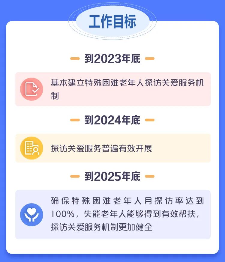 云南省民政厅、中共云南省委政法委员会等11部门联合发布《云南省关于开展特殊困难老年人探访关爱服务的实施方案》,明确建立探访关爱服务机制、丰富探访关爱服务内容、充实探访关爱服务力量、提升探访关爱服务质量效率、突出探访关爱服务处置五方面工作任务,保障特殊困难老年人基本养老服务需求,让每一位老年人都能生活得安心、静心、舒心。