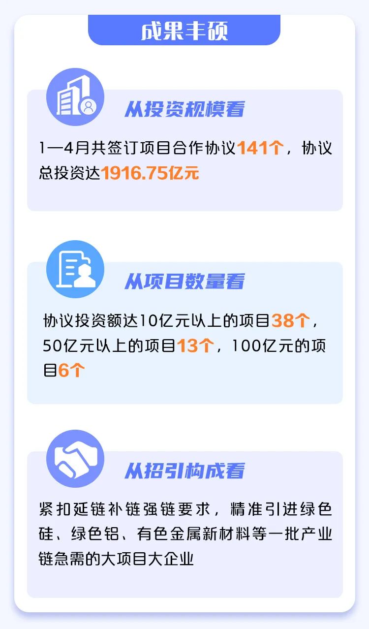 今年以来,云南省工业和信息化厅及各州(市)工信局狠下功夫深入研究产业链,选准赛道精准招商,全省工信系统奋勇争先抓项目、全力以赴拼经济,1—4月招商引资工作成果丰硕。