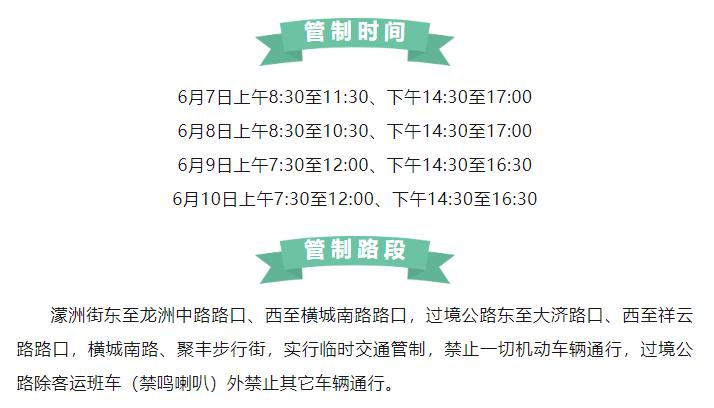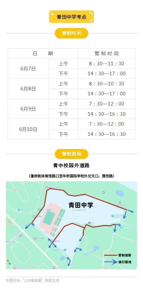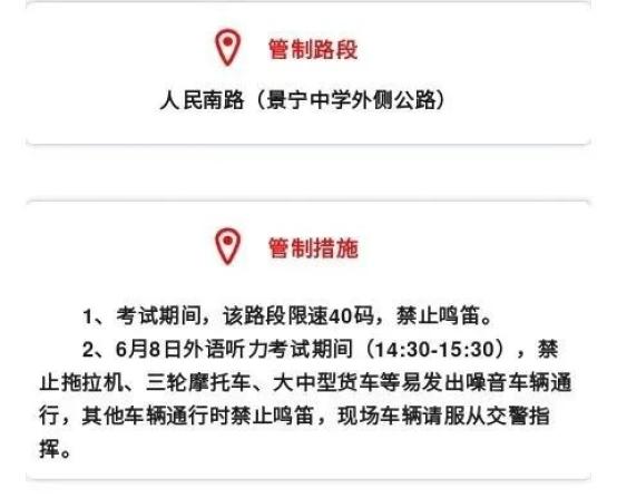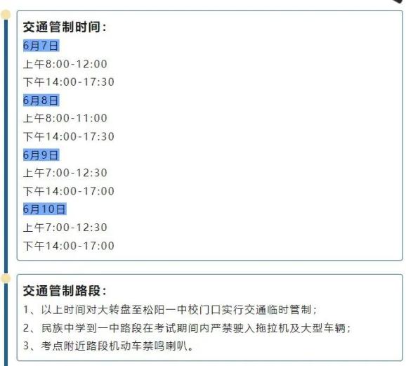 为确保高考期间考点周边道路交通安全、有序,为考生营造良好的道路交通环境,届时将在以下时间段对部分路段实行交通管制。