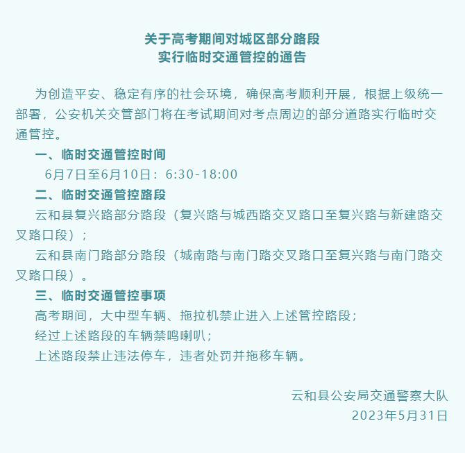 2023年6月7日、8日、9日、10日为全国高考日,为切实做好高考期间考点路段道路交通安全管理工作,确保高考期间辖区道路交通的秩序畅通有序,为广大考生提供一个良好的考试环境,全市交警部门提前对道路交通运行状况、易拥堵路段时段等进行了分析、研判,制定高考期间临时交通管制措施。记者将全市各地高考期间临时管制措施整理如下: