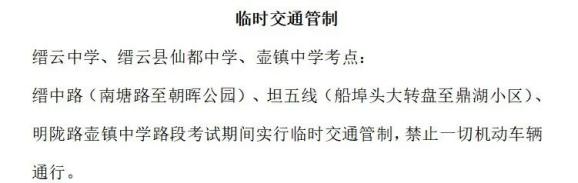 对莲都区紫金路及环城北路(丽水中学)路段、紫金路与崇正路(丽水中学通道)、丽阳街(丽水二中路段)、二中校门口、学士街(丽水职高)路段采取临时交通管制措施。