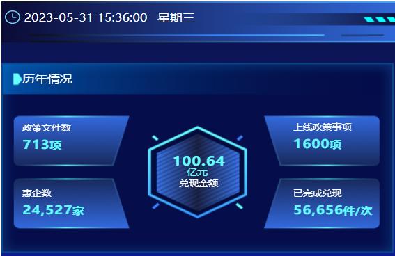 截至5月31日,2023年新上架政策事项436个,完成政策事项拆解1432个,其中完成推送31个,涉及企业1295家(次),完成兑现958件/次,涉及兑现奖补资金4.5亿元,惠及企业935家(次);其中“免申即享”兑现事项44个,完成兑现505件次,涉及兑现金额11438.04万元,惠及企业384家(次)。