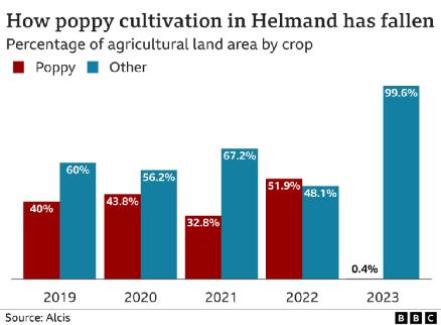 报道援引地理信息服务公司“Alcis”提供的卫星图指出,此前曾是阿富汗鸦片重要产出地的赫尔曼德省内,大量罂粟区在2022年至2023年间被铲除,现已种上了粮食。罂粟种植面积已从过去几年的30%-50%的比例,锐减至仅0.4%。