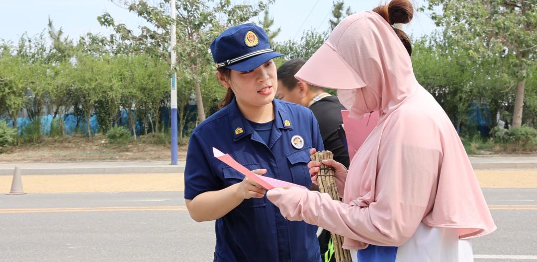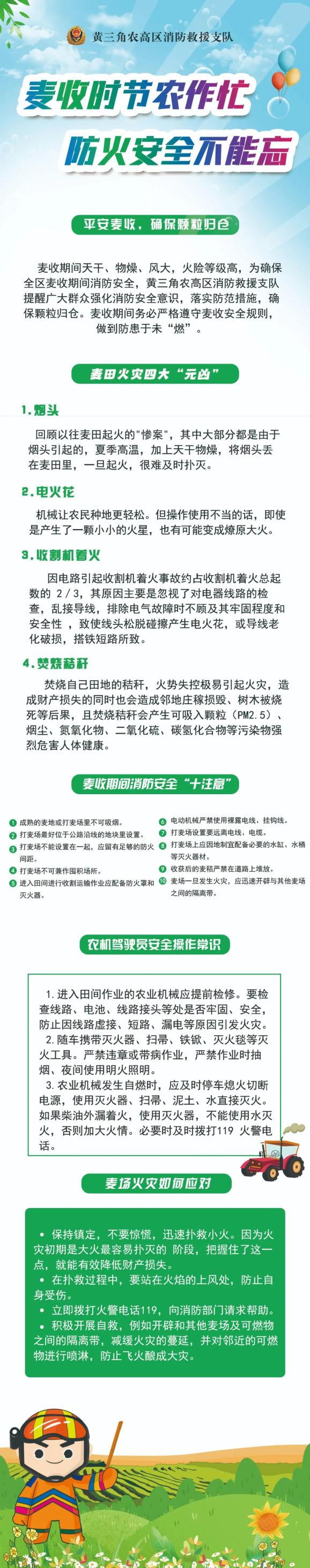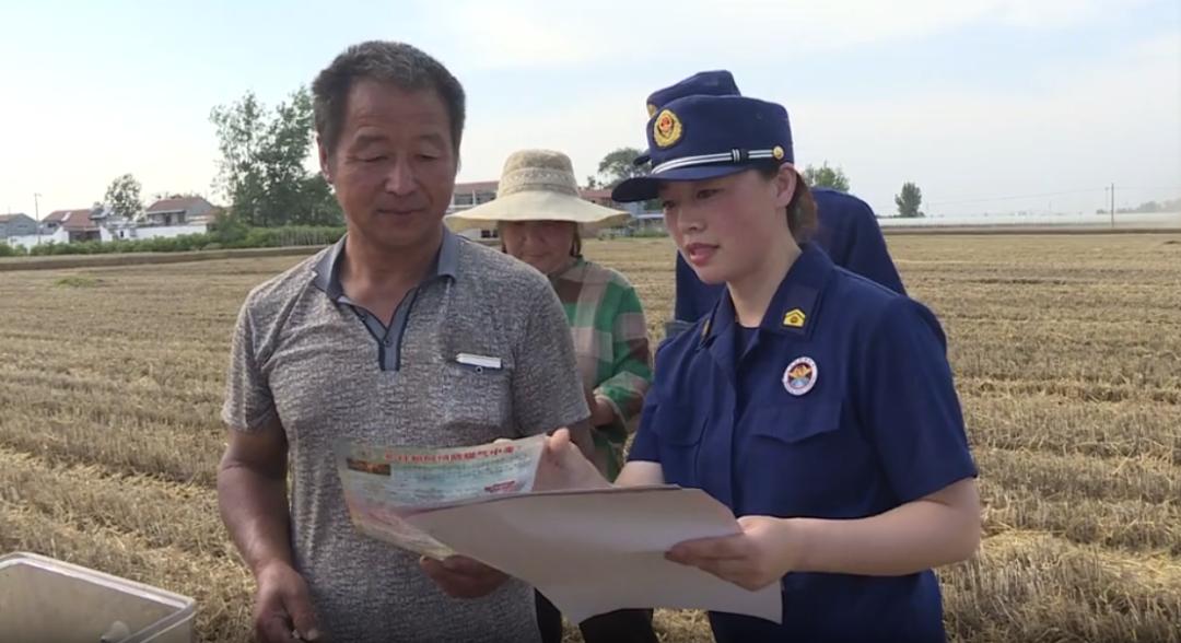 “麦收啊,要注意防火。咱麦收的时候秸秆不能在地里烧啊,地里不能有明火。”在滨州,滨城区消防救援大队成立麦收防火宣传队与消防志愿者一起深入晒麦场,向村民群众发放《夏收防火倡议书》等宣传资料,讲解麦收期间诱发火灾的因素以及防火措施,提醒广大农民群众增强防火意识,加强麦田收割机、机电设备的维护保养和日常检查,坚决杜绝田间、麦场吸烟和焚烧麦茬现象,发现火情及时处置并报警,防止“火烧连营”,确保颗粒归仓。