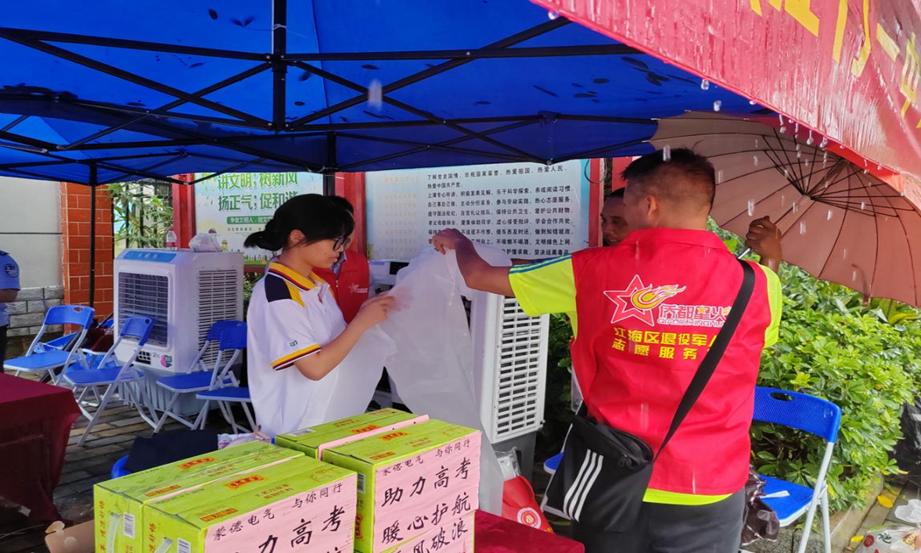 记者发现,江南街道网格员联同侨都星火志愿服务队设置了“网格爱心助考点”,为有需要的群众和考生发放雨衣和清凉饮料。