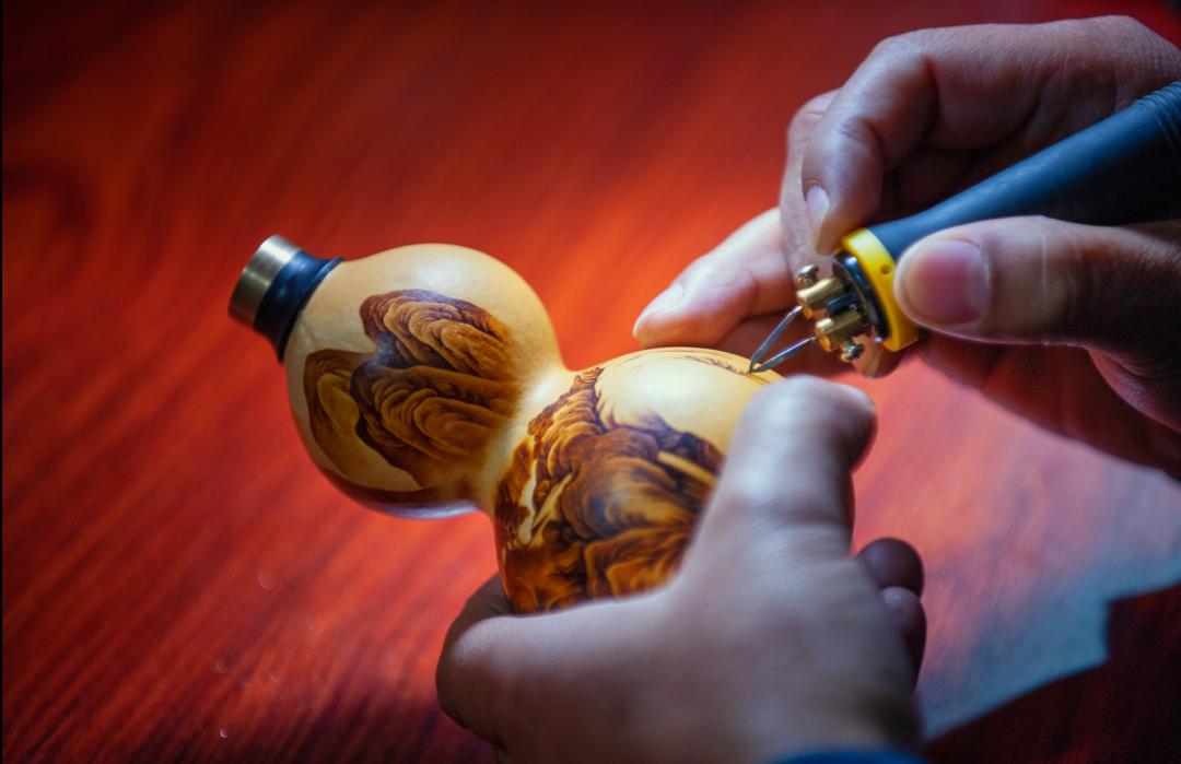 它是国家级非物质文化遗产,用料考究刻工纯熟,线条流畅图案丰富。原料多以大葫芦、亚腰葫芦和扁圆葫芦为主,雕刻制作分水煮发酵、雕刻、上色三道工序。
