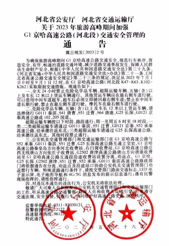 <中华人民共和国道路交通安全法>办法》第二十一条、《河北省高速公路交通安全规定》第二十三条的规定,决定从2023年7月1日0时至9月1日12时,在G1京哈高速公路(河北段K47-K63、K102-K262)采取限制交通措施。现通告如下:中华人民共和国道路交通安全法>一、全天24小时禁止危险化学品车辆、超限运输车辆、五轴(含)以上及车长12米以上货运车辆通行。其他货运车辆应在最右侧车道行驶,可以借用中间车道超车,超车后必须立即驶回最右侧车道;禁止在中间车道长期行驶,禁止在最左侧车道行驶。摩托车在最右侧车道行驶。