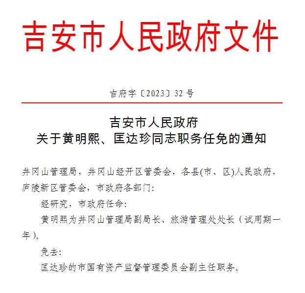 黄明熙为井冈山管理局副局长、旅游管理处处长(试用期一年)。