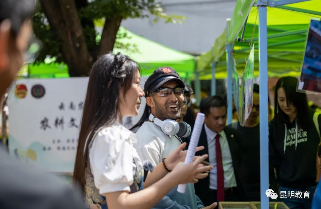 在校团委设置的农耕文化集市里,学生主持人流连在不同的展位上,体验着各种各样有意思的项目,还遇到了学校里一名巴基斯坦同学,他是一名博士生,研究农业昆虫与害虫防治,知对方非常喜爱中国传统文化后,他们围绕这一话题开心地聊了起来。