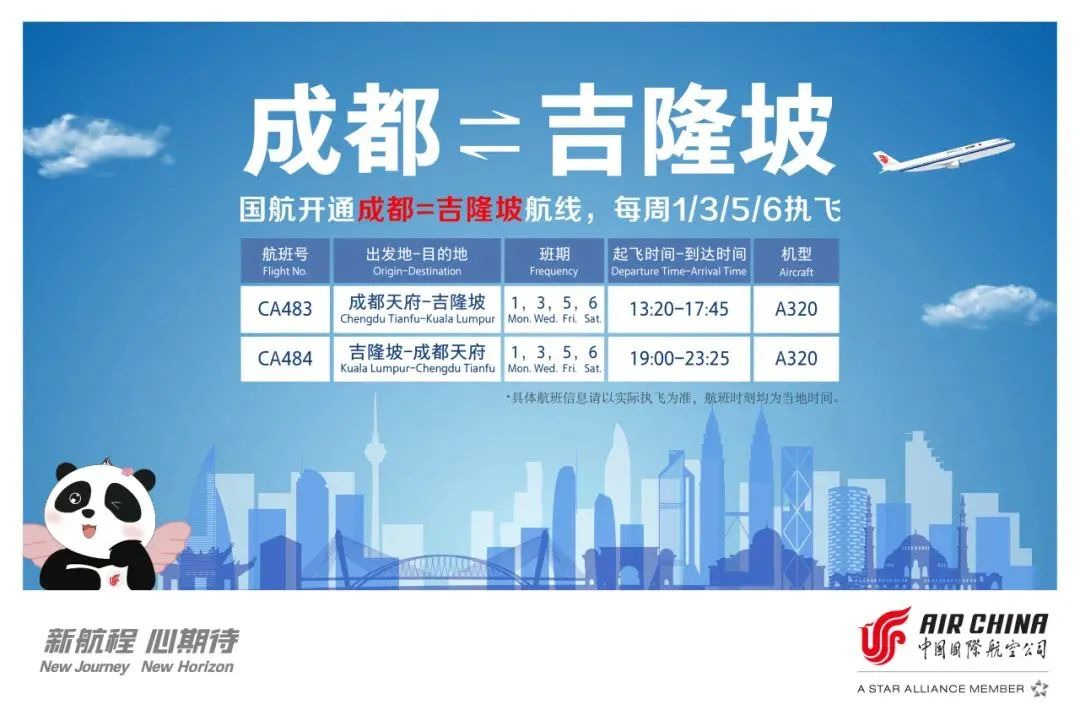 据国航西南消息,国航成都天府直飞吉隆坡往返航班每周四班,分别于每周一、三、五、六执飞,计划采用空客A320机型执行。