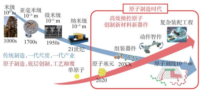 在人类历史上,制造技术一直扮演着不可替代的角色,促进了文明的进步和发展。如图1所示,制造技术特征尺度的不断演进推动了新工具和新产品的涌现,促进了社会的发展。可以预见,具有原子级精度的原子制造技术将成为推动下一次科技革命的核心。正如诺贝尔奖获得者理查德·费曼所言:“如果想要真正理解自然界的一些事物,我们必须从原子尺度进行考虑”。如何开发和实现原子制造技术?如何利用原子制造技术创造具有颠覆性能力的全新产品?这些问题促使原子制造成为自“十三五”以来大国竞争的关键技术焦点之一。这一技术将在微观层面上创造全新产品。美国国防部高级研究计划局和能源部自2015年起就率先部署了相关的研究计划,并在2022年发布的《美国先进制造国家战略》中进一步强化了原子制造在微电子制造领域的应用。我国科技部门也已经清醒地认识到原子制造技术的重要性,意识到掌握这项技术将有助于扭转我国在集成电路、量子科技、新材料创制、精密元器件等领域的被动局面。因此,我国从2016年起就开始展开围绕“原子制造”这一主题的学术研究、关键科学问题发布和重大研究计划部署,以推动我国在这一领域的发展。