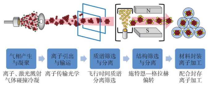 原子分子束流是最早具备一定原子尺度操控能力的技术之一,其最典型的应用是团簇束流。如图2所示,该团簇束流装置采用“气相随机凝聚+谱学测量分选”的原理[1],其基本流程如下:首先,利用激光烧蚀、离子溅射、热蒸发等方法,产生目标材料的高密度原子蒸汽;然后,通入大量惰性气体,使该材料的原子之间充分碰撞并冷却,从而产生包含各种原子数和结构的团簇;随后,电离这些团簇,获得带有一个电荷的团簇离子;最后,通过类似于日常质谱的技术(如磁偏转、飞行时间法和四极杆等),按照质量进行分选,即可获得特定原子数的团簇。在此基础上,如果将团簇束流通过施特恩—格拉赫磁铁,利用不同结构的团簇磁矩不同的特点,将束流进行偏转,就可以获得特定原子数和特定结构的团簇。此外,在操作中,可以引入拾取(pick-up)腔,该腔由一个原子气室和一个质量筛选器组成,从而实现逐个或指定数量的原子添加到团簇上的操控需求。这项技术是实现原子制造的一种重要手段,我们可以追踪原子制造技术的发展历程并从中总结出相应的规律与经验。