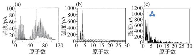 图3 质量选择团簇束流流量的发展 (a) R. Smalley早期得到的C60离子质谱,流量在皮安量级[5];(b)伯明翰大学Ag3团簇质谱[7],流量在纳安量级;(c)2022年南京大学产生的Ag3团簇质谱,流量在微安级