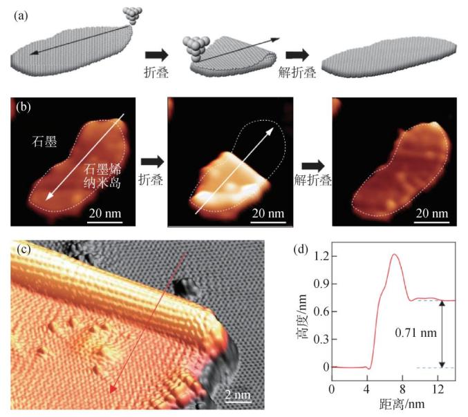 图5 石墨烯纳米结构原子精准的可控折叠[13] (a)沿任意方向折叠和解折叠石墨烯纳米结构的示意图(细长的黑色箭头为折叠方向);(b)折叠和解折叠石墨烯纳米结构的STM实验图;(c)折叠石墨烯纳米结构的三维STM图像;(d)沿图(c)中红色箭头方向的AFM图像,左下方平坦处高度约为0.71 nm