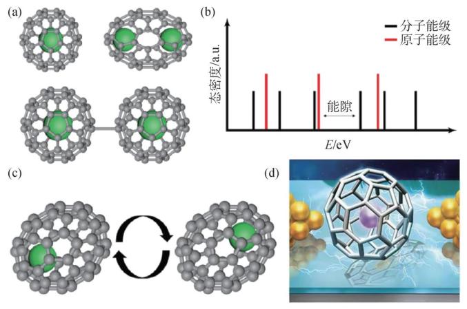 图6 内嵌富勒烯分子作为单原子中心和器件的思路[16] (a)内嵌富勒烯分子结构图,为类鸡蛋形;(b)内嵌富勒烯中特定原子的能级可以在一系列分子能级中区别出来;(c)分子中特定原子的位置可以被操纵,图(a)、(c)中富勒烯包裹的绿色小球代表Gd原子;(d)一种可检测特定原子诱导的电子信号的内嵌富勒烯单分子器件,它具有很高的可控性