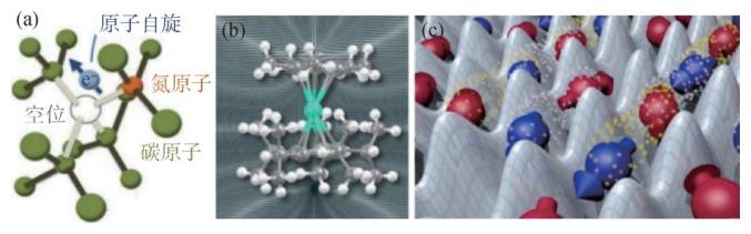 图7 更多的单原子操控对象 (a)金刚石色心;(b)配体包裹的金属单原子中心[17];(c)光晶格中的单原子[18]