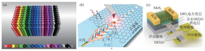 图8 (a)二维材料设计原子级多层异质结的巨大空间;(b)国家纳米中心戴庆等人通过在MoO3上覆盖石墨烯构筑范德瓦耳斯异质结,天线激发的极化激元穿过界面后形成负折射[20];(c)南京大学王欣然等人设计的二维半导体训练—推理一体化存算器件[21]
