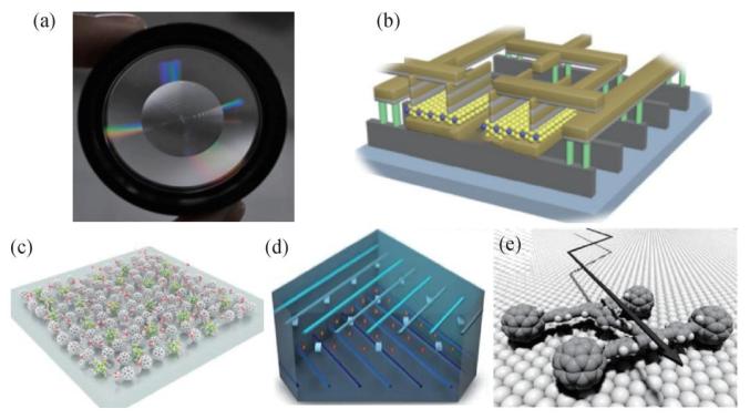 图10 原子制造能造什么?(a)原子级精密加工的光学器件[27];(b)二维原子层制备的原子级集成电路[28];(c)原子以及原子团簇组装的杂化材料[29];(d)单原子量子计算机[30];(e)原子零件与分子机器[31]