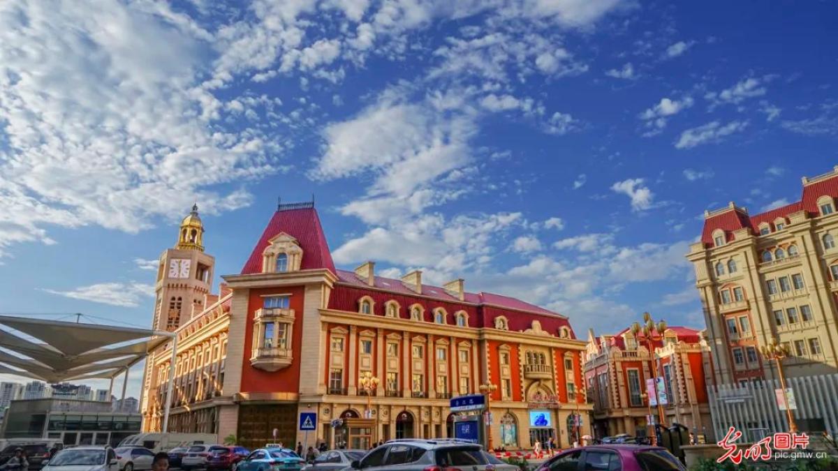 2023年6月10日,天津海河津湾广场蓝天白云美如画,游船穿梭海河之中,标志性建筑红顶津湾成为网红打卡地。(金立冬摄/光明图片)