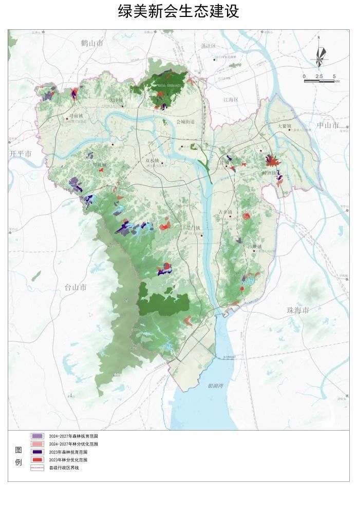 2023-2027年,将对全区重要生态区域林地优化提升3.5万亩,抚育4.52万亩,整体提升新会区森林质量。整体对圭峰山国家森林公园景观提升,对绿护屏、北坑滑草场、西入口、石涧等区域重点种植枫香、落羽杉等红叶树种,丰富森林公园景观色彩,打造春花秋叶景观,营造四季有景的林相。完善森林公园基础设施建设,丰富圭峰山茶花园景区植物品种,打造成地区性植物园,提升森林公园科普、康养等功能,将圭峰山建设成为江门市绿美生态建设示范点。同时,实施历史遗留矿山修复,2023-2027年,完成历史遗留矿山综合治理任务1800亩,重点修复江门大道、银洲湖两旁等区域受损山体,让山体重披绿装、重展绿颜。