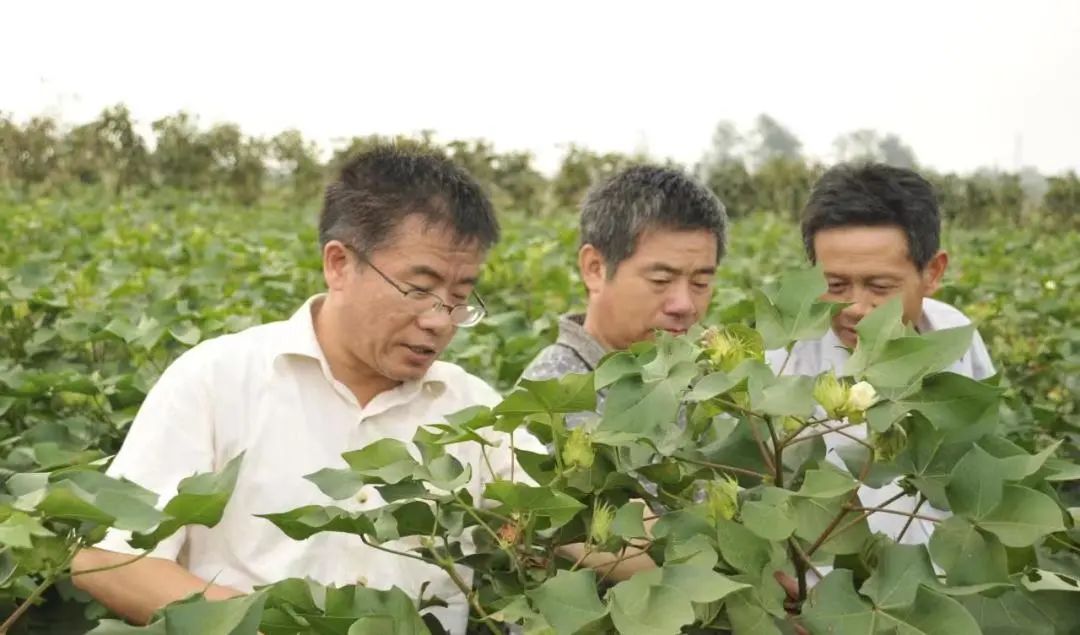张献龙教授等在查看华杂棉 H318长势(涂礼莉 供图)