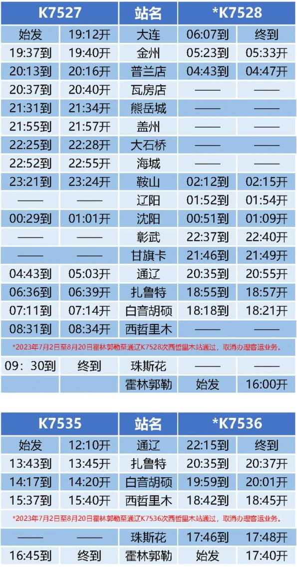 自2023年6月30日起,开行大连至珠斯花K7527次(珠斯花终到);自7月1日,开行霍林郭勒至大连K7528次(霍林郭勒始发)。