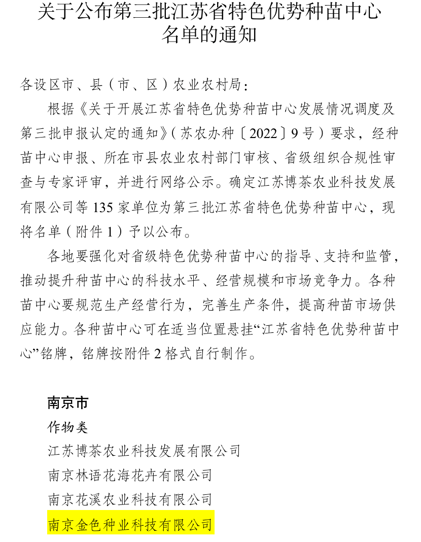 2022年2月,金色种业成为南京市第一家从事草莓种苗繁育并取得种子生产经营许可证的企业。公司一期基地建设投入800万元,建设现代化连栋温室、高架栽培系统、现代化高标准育苗床、自动化水肥系统和劳动管理系统等。