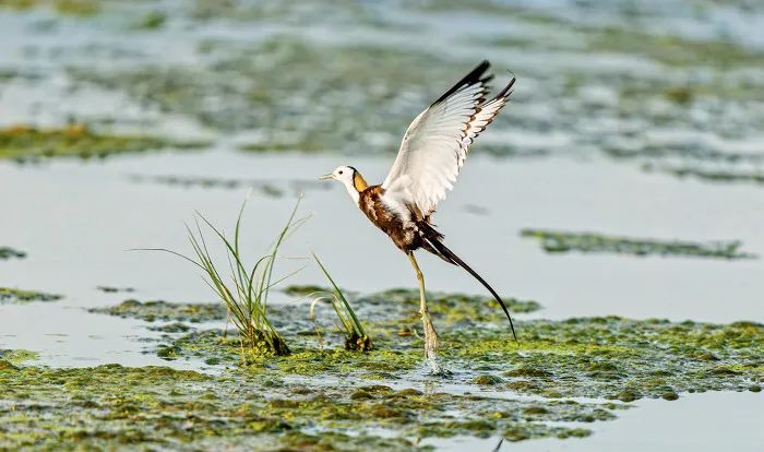 7月5日,在运城盐湖,鸟类吸引不少摄影爱好者前来拍摄。盐湖实行退盐还湖后环境得到极大改善,少见的水雉鸟、鸳鸯、黑尾塍鹬和红胸田鸡等稀有鸟类前来筑巢繁衍。
