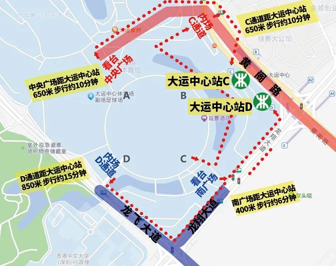 ▲观众出入口至大运中心地铁站行进路线