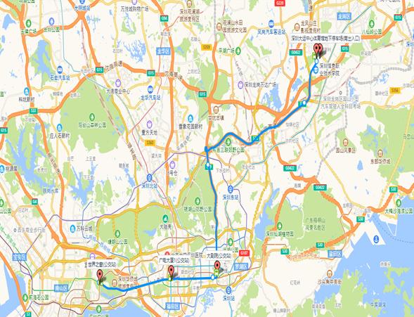 每晚300台车统一由龙飞大道右转至龙翔大道,由龙翔大道上水官高速转清平高速,行驶至深南大道。