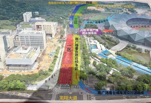 龙飞大道(青春路——龙翔大道)双方向散场前封闭,用于接驳大巴停放。