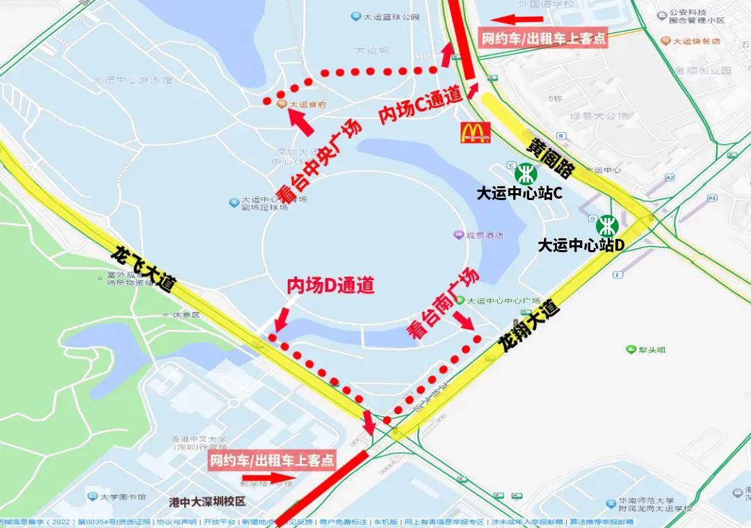 拟在黄阁路南行体育馆公交站至内场C入口路段、龙翔大道西行香港中文大学路段设立两处网约车、出租车上车点。