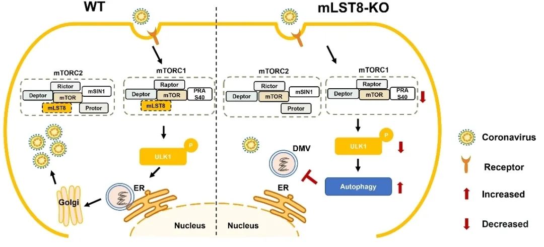 彭贵青教授团队研究发现一种新的宿主因子mLST8对冠状病毒感染至关重要。敲除mLST8抑制了mTORC1信号通路,并且是mTORC1而不是mTORC2信号通路对冠状病毒的复制至关重要。进一步机制研究表明敲除mLST8导致mTORC1下游因子unc-51样激酶1(ULK1)的磷酸化水平降低促进了自噬的激活,而自噬是mLST8 KO细胞抗病毒复制的关键。透射电子显微镜成像分析表明,敲除mLST8 和自噬激活剂均能抑制冠状病毒双层囊泡(DMVs)的形成。