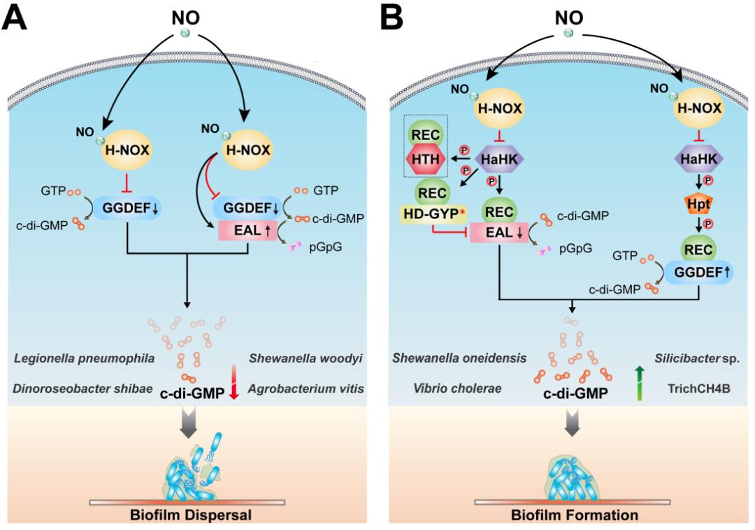 何进教授团队花费三年多的时间,针对c-di-GMP代谢酶感知气体或光信号的相关结构域进行了深入地比较分析,揭示了它们的结构类型和分布情况,并根据文献总结/推测了相关环境信号调节c-di-GMP信号通路的机制。值得一提的是,该综述论文还分析比较了具有相同气体/光感应功能的感知结构域之间的差异和联系,评估了它们在细菌中的特定生理功能和角色定位,对未来该领域的研究工作具有重要的指导意义。该综述不仅弥补了此前c-di-GMP研究领域的缺憾,可促进c-di-GMP调控网络的丰富和完善,还能为药物设计提供新靶点,为生物传感研究带来新思路。
