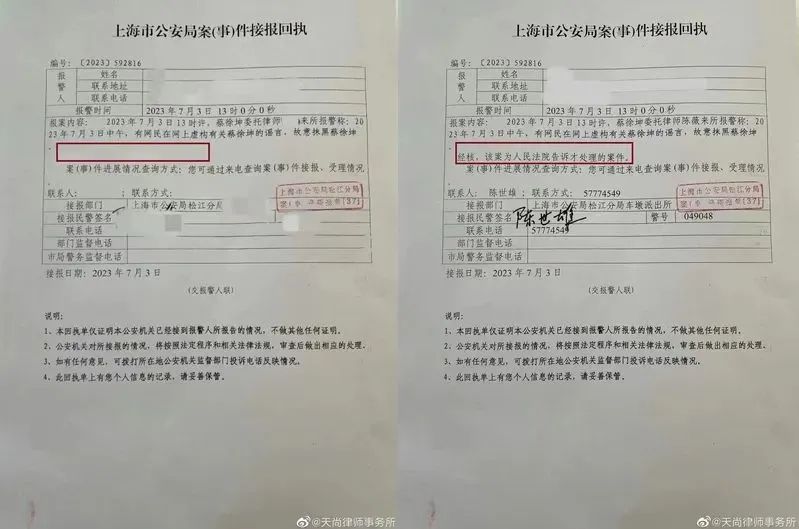 7月3日傍晚,蔡徐坤方律师事务所发布微博称,针对微博用户对蔡徐坤先生的造谣诽谤行为已报警,并晒出一张接报回执。两个多小时后,该律师事务所再次发微博,晒出同一张接报回执并表示将向人民法院提起刑事自诉,追究相关人员责任。