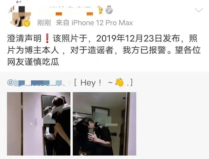 同一天下午14时19分,该照片中的主人公也在网上现身,表示该照片是自己2019年年底发布的,照片中人是自己和妻子,同时也表示“我方已报警”。下午16时许,该网友也晒出了一张“报警证明”。