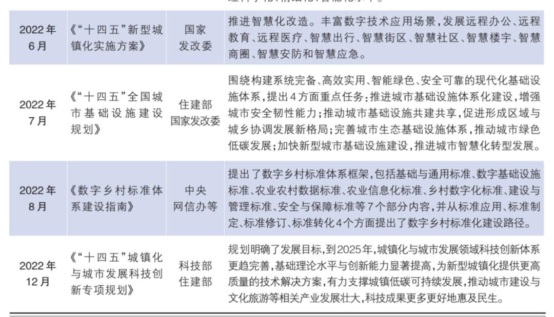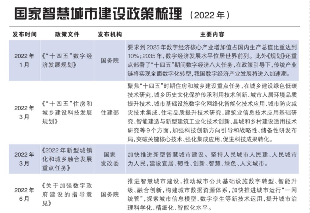 2022年,国家陆续出台《“十四五”数字经济发展规划》《“十四五”住房和城乡建设科技发展规划》《关于加强数字政府建设的指导意见》等政策,明确了智慧城市作为我国城镇化发展和实现城市可持续化发展方案的战略地位,以及“推进智慧城市建设”的任务,智慧城市进入加速发展阶段。