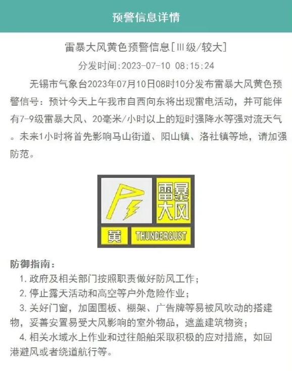 无锡市气象台2023年07月10日08时10分发布雷暴大风黄色预警信号:预计今天上午我市自西向东将出现雷电活动,并可能伴有7-9级雷暴大风、20毫米/小时以上的短时强降水等强对流天气。未来1小时将首先影响马山街道、阳山镇、洛社镇等地,请加强防范。