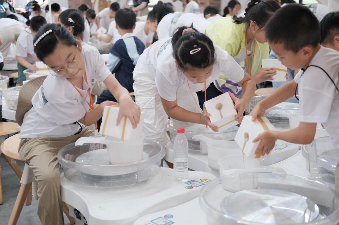 告别了陶瓷工业遗产博物馆,孩子们迫不及待想要上手拉坯。这是一项非常有趣的手工艺术活动,孩子们可以充分发挥自己的想象力和创造力,利用双手、陶轮和各种工具将陶土变成各种有趣的形状和造型,亲身领略从泥到物的神奇之旅。“这是我第一次来景德镇,也是我第一次拉坯,我觉得很好玩,我从小就喜欢捏泥巴!”一名六岁的研学小朋友高兴地对记者说。