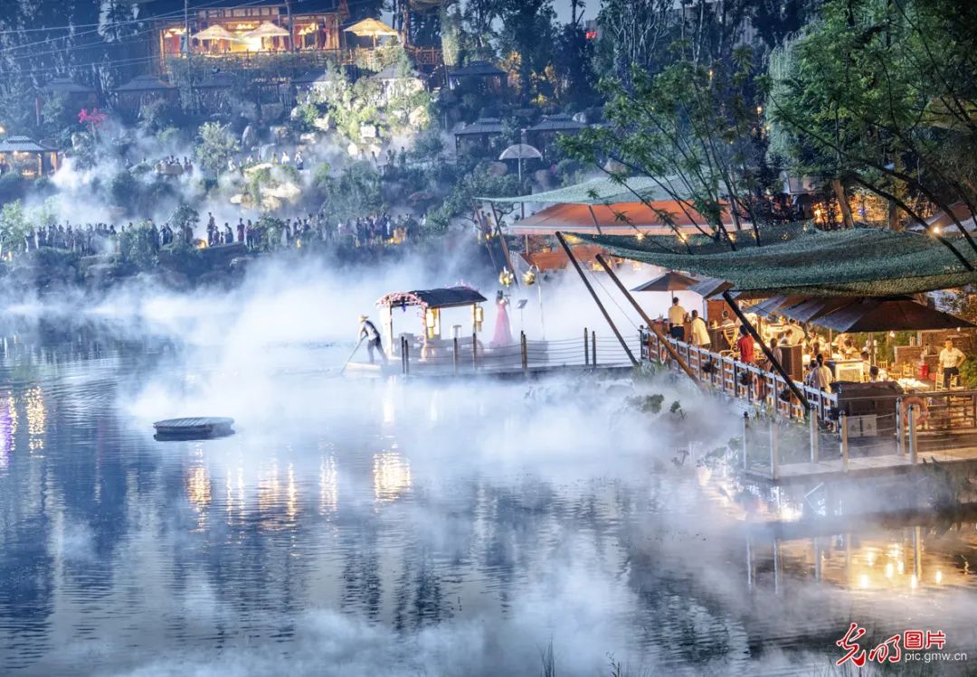 2021年7月20日,成都天府芙蓉园玛歌·迪仙庄园灯火辉煌,人声鼎沸,上千人的火锅餐厅座无虚席,《乐动迪仙》水上演艺,精彩纷呈。(刘国兴摄/光明图片)