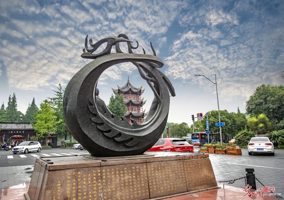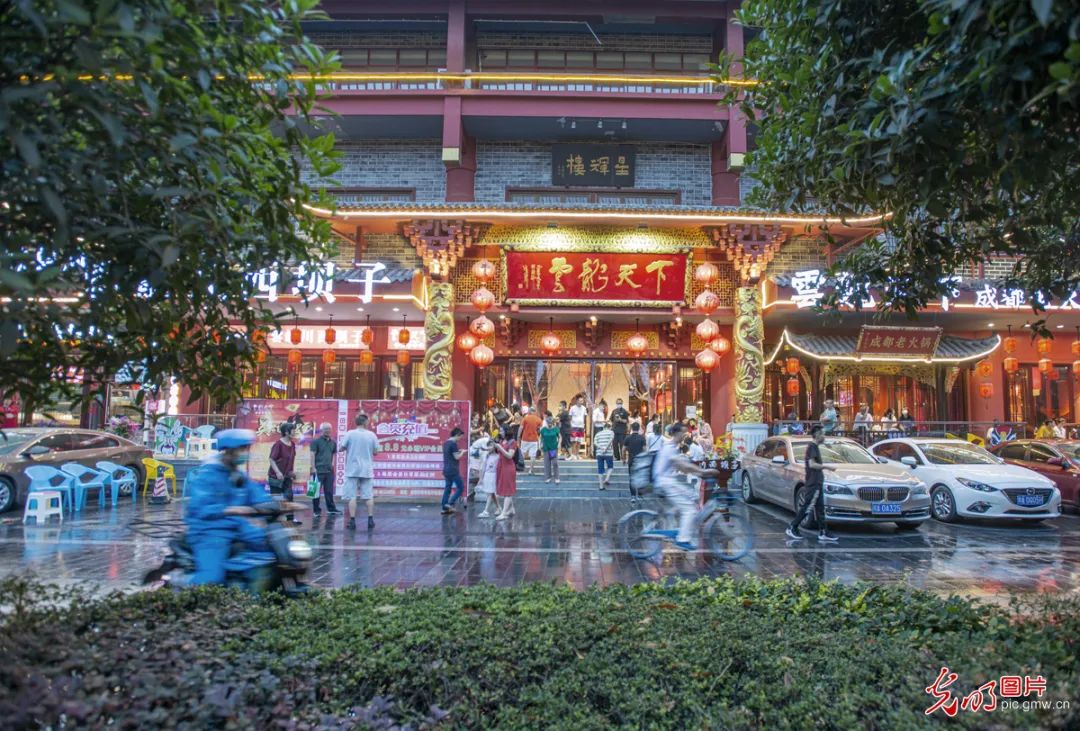 成都琴台路全长900米,以汉唐仿古建筑群为依托,以司马相如和卓文君的爱情故事为主线,展示汉代礼仪、舞乐、宴饮等风土人情。(刘国兴摄/光明图片)