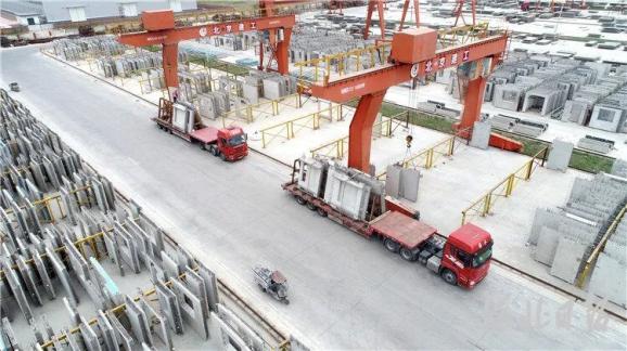 在文安县恒均建材科技河北有限公司装配式建筑半成品存放区,工人正在吊装PC预制外墙成品。