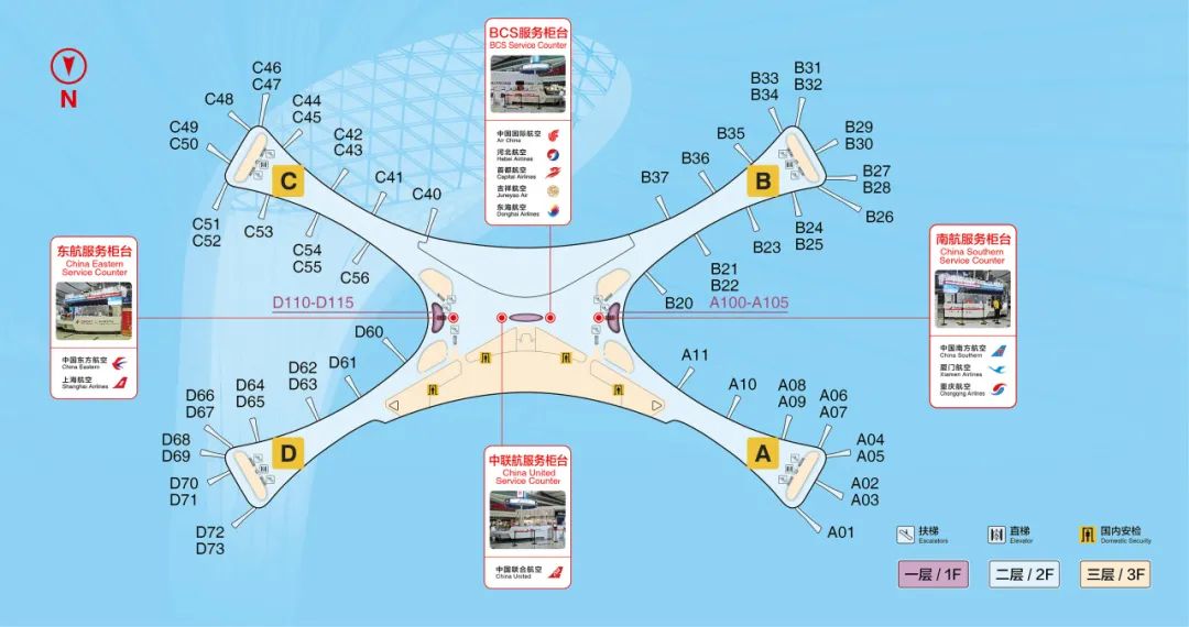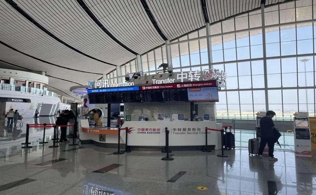 非通程无托运行李的中转旅客同样无需离开隔离区,大兴机场在隔离区设置了四处中转柜台,旅客根据转乘下一班航班的具体航司,于相应中转柜台办理中转手续,前往下一班航班所在登机口即可。