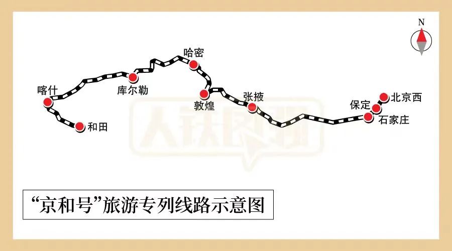 北京始发,直抵祖国西北本趟“京和号”旅游专列全程共计16天,从首都北京出发,火车一路向西,直抵祖国西北地区,途经张掖、敦煌、哈密、库尔勒、喀什、和田等地。