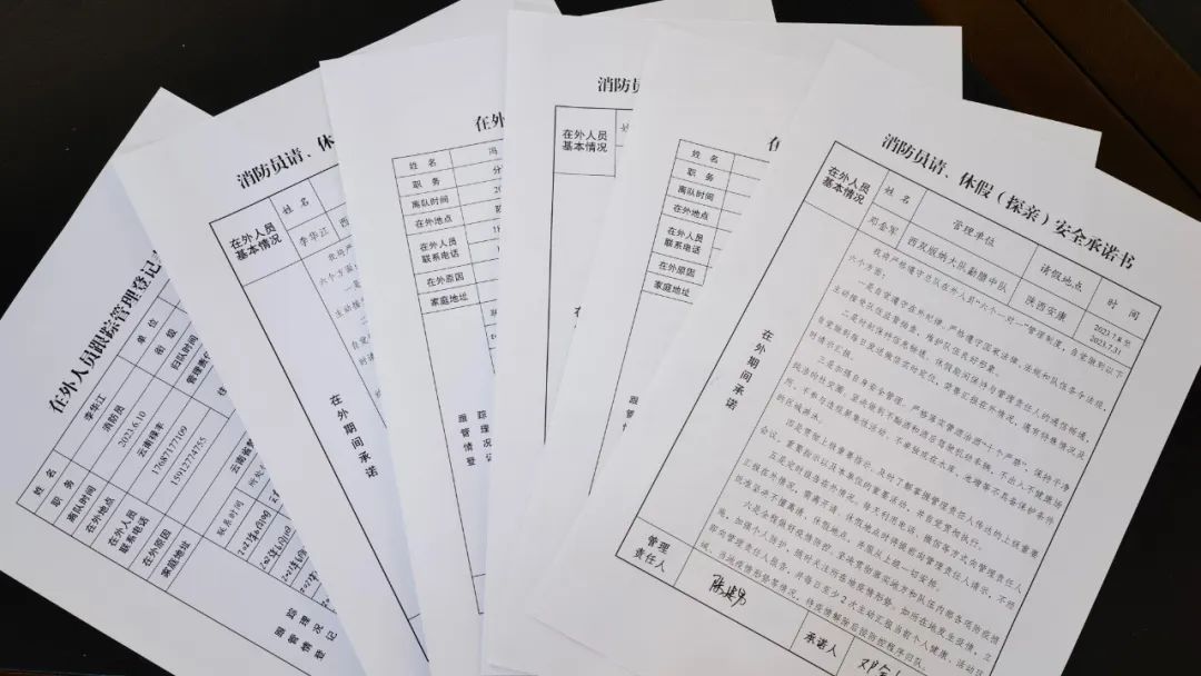 在确保人员思想稳定的前提下,严格落实各项规章制度和管控要求。离队前,通过签订《在外人员安全承诺书》《在外人员跟踪管理登记表》、上报休假行程、排查休假路线等方式,打通行程“安全通道”,依托在外人员管理群,每日检查休假情况,中队干部骨干“点对点”管理,严格落实“六个一对一”制度。坚持做到离队有交代、中途有提醒、在家有汇报,做到全过程管控,不留死角、不挂空挡,确保人员在外思想不松懈,把全体指战员思想认识提升到“抓安全就是铸忠诚,保安全就是保大局”的高度上来。
