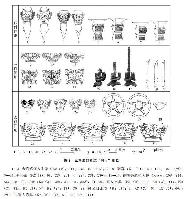 3.多件同形。如:(1)二号坑出土的C型铜人面具16件,报告称“大小、形制基本相同”,已发表其中5件,器高25.2—26.6厘米(图1:29—33)。(2)二号坑出土的D型铜人面具6件,报告称“形制基本相同”,其中除1件较小外(K2(3):65,高12.6厘米),其余5件大小相若,高15—15.6厘米(图1:21—25)。(3)二号坑出土铜太阳形器均为砸碎的残片,经拼对可知有6件,发表了其中较为完整的3件,形制相同,大小相若(图1:26—28),三器可供比较的阳部直径在27.8—28厘米,其中完整的两器直径为84、85厘米。