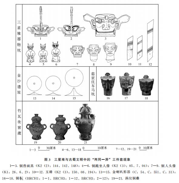 摘 要:器用现象是上古中国青铜礼制的本质体现。三星堆文化器用现象可见“同形”“列器”“三件套”三种,这是该文化青铜礼制形态的基本特征。三星堆文化中“夏器”器用可能多遵循了“夏(列)器夏礼”,“夏器夏礼”在古蜀文明中的延续与绽放,是中原地区礼失而求诸野的又一例证。同形现象是商文化青铜礼制的特质,三星堆文化中的同形现象是“同形商礼”的体现,表明三星堆文化与商文化青铜礼制同频共振。三件套现象是三星堆文化青铜礼制的特质,是“蜀礼”的根本体现。三星堆青铜礼制形态与特质的揭示,首次从礼制角度表明了古蜀文明是上古中国大地上多种文明融合之产物,进一步证明了古蜀文明是中华文明的有机组成部分。