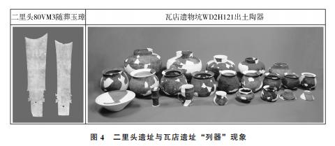 其三,在文献记载的夏人活动区域,早于二里头文化、有可能为早期夏文化的遗址中,已发现一些列器现象。如:(1)河南叶县余庄遗址墓葬M10随葬的陶器中,6件高柄杯、7件豆、7件觚、7件杯分别形制相若,大小相次,被认为“或具有列器性质”。(2)禹州瓦店遗址中,与祭祀建筑WD2F1相关的遗物坑WD2H121出土的“9件陶鼎大小有序似为列鼎,5件陶瓮亦大小有序”(图4)。该坑属瓦店龙山三期早段,碳十四测年数据为1916BC—1811BC,已进入夏代纪年。该遗址还发现有“列觚”。当然,根据上述线索提出的“列器夏礼”假说,还有待进一步探讨。